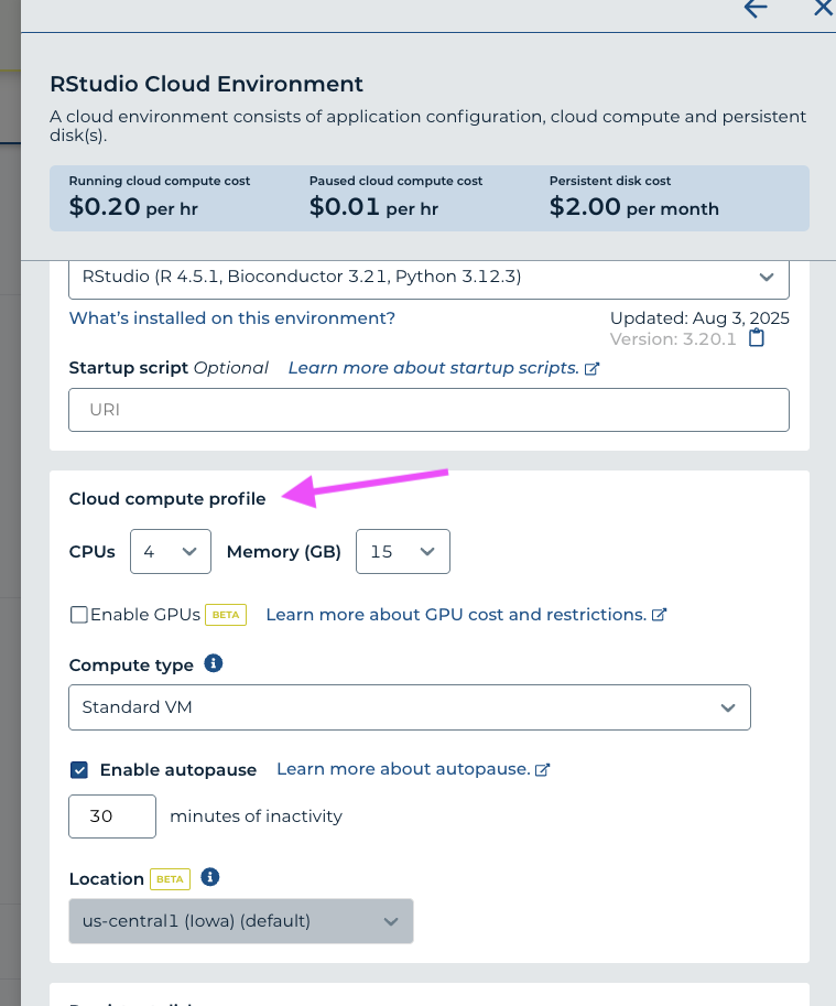It looks like you might have selected a ~60GB RAM option when setting up your RStudio environment. You can try adjusting the CPU and RAM for greater memory options. Please note that with more resources, the expense per hour will be increased.